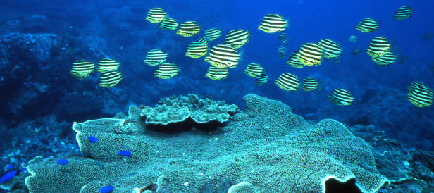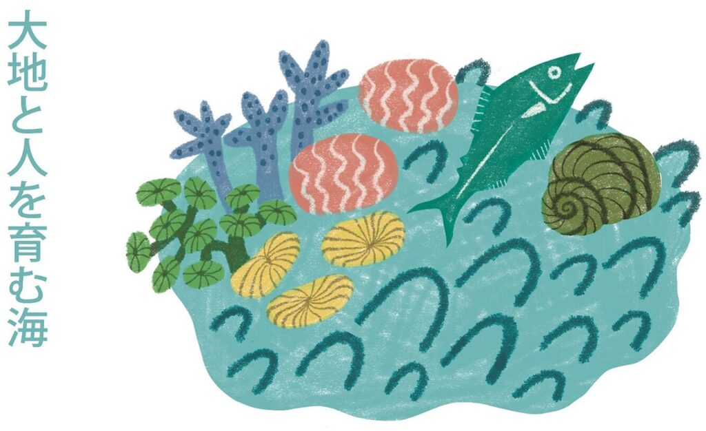 島を取り巻く海には、豊かなサンゴ礁の世界が広がっています。喜界島には400年以上生きるサンゴや、色とりどりのサンゴ達が元気よく生きています。このサンゴ達は、成長と共につくりだす石灰岩を積み重ね、やがてサンゴ礁となります。そのサンゴ礁は、地面が上昇する隆起の力によって、だんだんと海面より高くなり、階段状の段丘をつくるのです。喜界島の大地、隆起サンゴ礁段丘は、海に生きていたサンゴ達によって作られているのです。今も喜界島の海にはサンゴ達と共に、たくさんの魚や貝などの生き物たちが生きています。この豊かな生き物たちは、喜界島の人々に豊かな恵みをもたらしています。喜界島のサンゴ礁の海は、過去から現在まで、大地と人を育む源になっています
