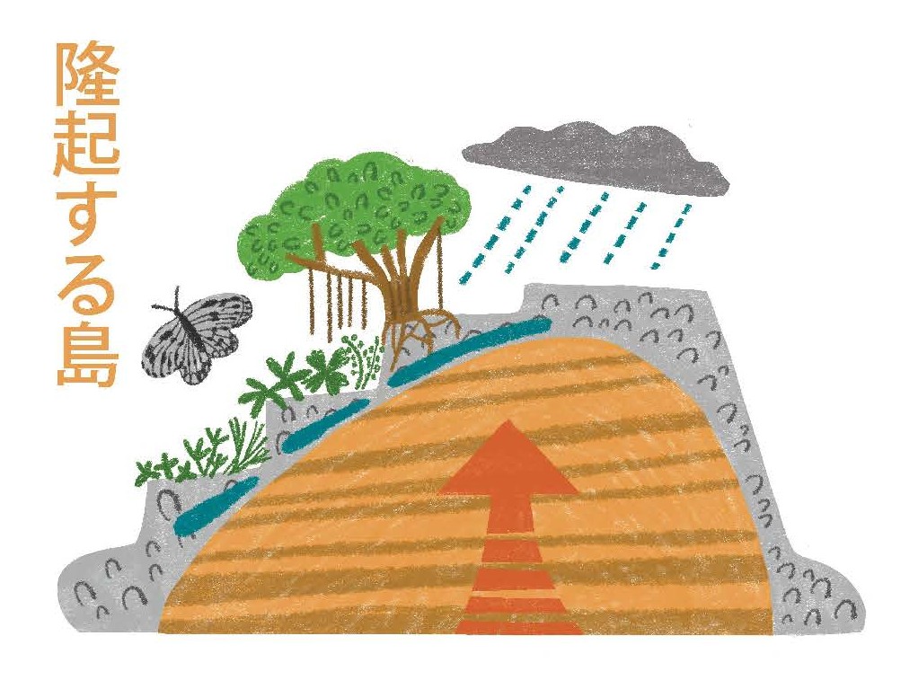 その昔、海の中で砂や泥が海底に降り積もり、砂と泥のしましまの地層ができました。その地層は、地球内部の力で海面に向かって上へ上へと持ち上げられていきました。そこの海底は浅くなり、サンゴなどの生き物達が増えてサンゴ礁ができました。さらに持ち上がる力によって海面よりも高くなったサンゴ礁は陸(大地)となり、およそ10万年前、喜界島が誕生したのです。