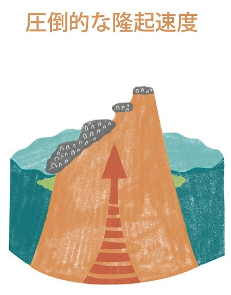 その後、さらに海底が持ち上がり、海の中にあったサンゴ礁が陸となり、島になりました。