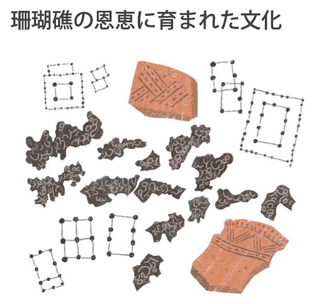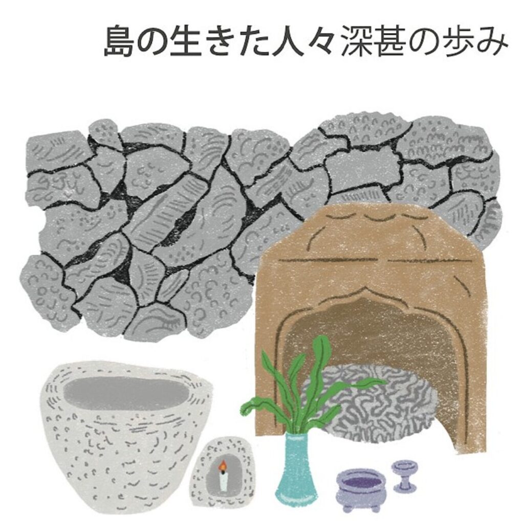 このような人と自然が結びついた豊かな段丘上には、縄文時代から人々が生活をしていました。今は見えないけれども、私たちの生活の痕跡が遺跡として残されています。また、喜界島の人たちは、昔からサンゴの化石を石材として活用してきました。今でも島にはサンゴの化石でできた墓石や石垣がたくさん残されています。またサンゴ礁の豊かな海からは、魚や貝、界島は、サンゴ礁が隆起してできました。そのため、平らな場所が多く、島の人たちはサトウキビ畑として利用しています。サンゴが作り出した石灰分を含む土壌はミネラルが多く、おいしい農作物や日本一の生産量を誇るゴマが育ちます。このような人と自然が結びついた豊かな段丘上には、縄文時代から人々が生活をしていました。今は見えないけれども、私たちの生活の痕跡が遺跡として残されています。また、喜界島の人たちは、昔からサンゴの化石を石材として活用してきました。今でも島にはサンゴの化石でできた墓石や石垣がたくさん残されています。またサンゴ礁の豊かな海からは、魚や貝、海藻などの食料を得てきました。このように喜界島では、サンゴ礁と人の繋がりが色濃く残る独自の「サンゴ礁文化」が育まれてきたのです。