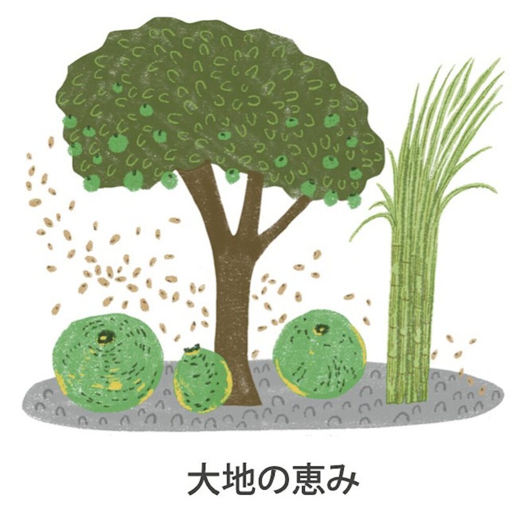 喜界島は、サンゴ礁が隆起してできました。そのため、平らな場所が多く、島の人たちはサトウキビ畑として利用しています。サンゴが作り出した石灰分を含む土壌はミネラルが多く、おいしい農作物や日本一の生産量を誇るゴマが育ちます。