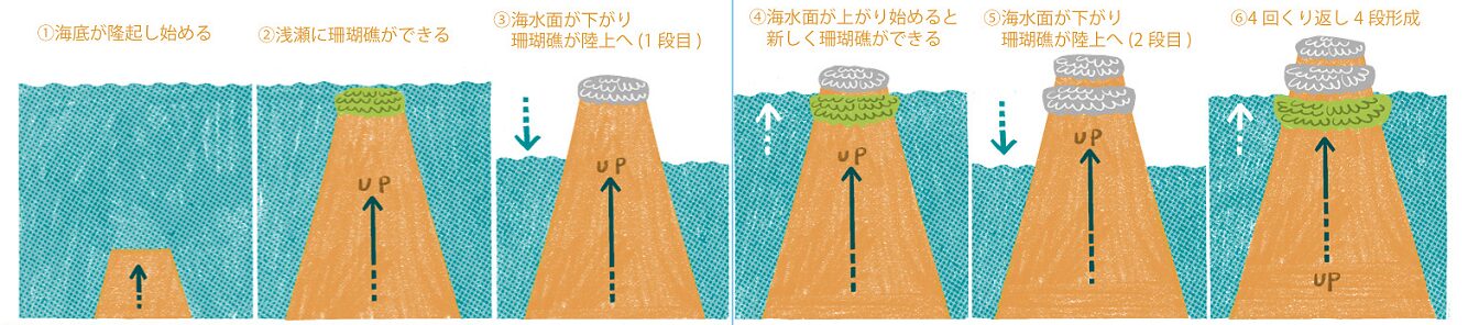 その後、さらに海底が持ち上がり、海の中にあったサンゴ礁が陸となり、島になりました。