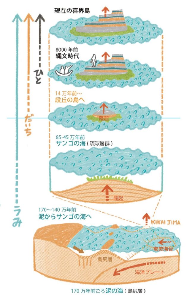 喜界島は、昔、海の底にありました。大地が動いて海底が持ち上がり(隆起)、浅い海ができたところにサンゴが棲みつき、サンゴ礁ができ島になりました。これが喜界島のはじまりです。